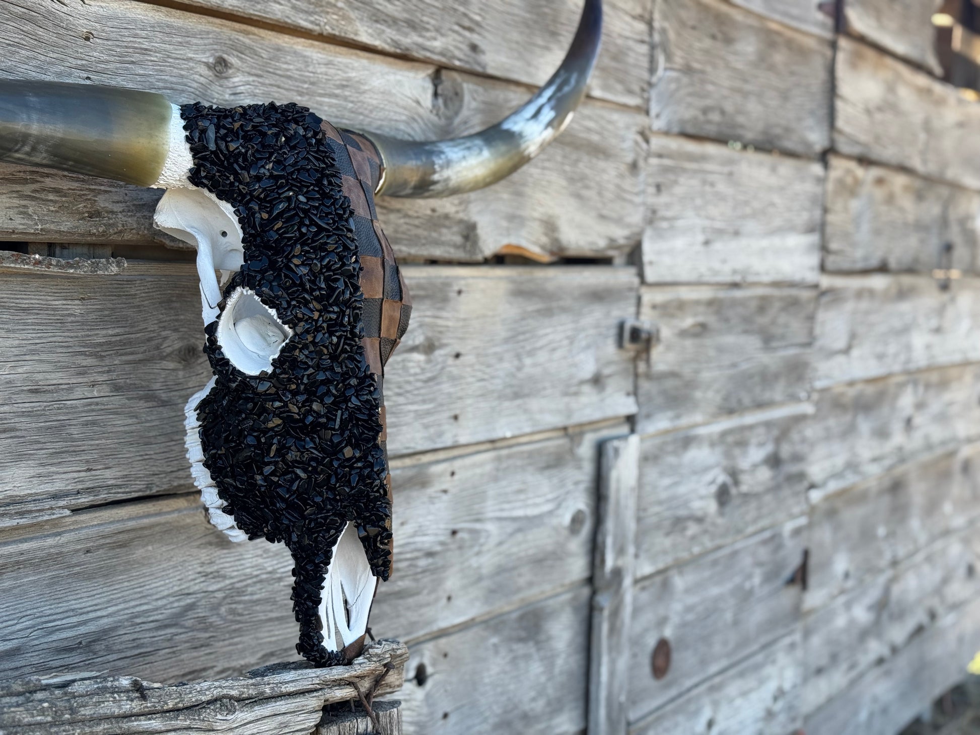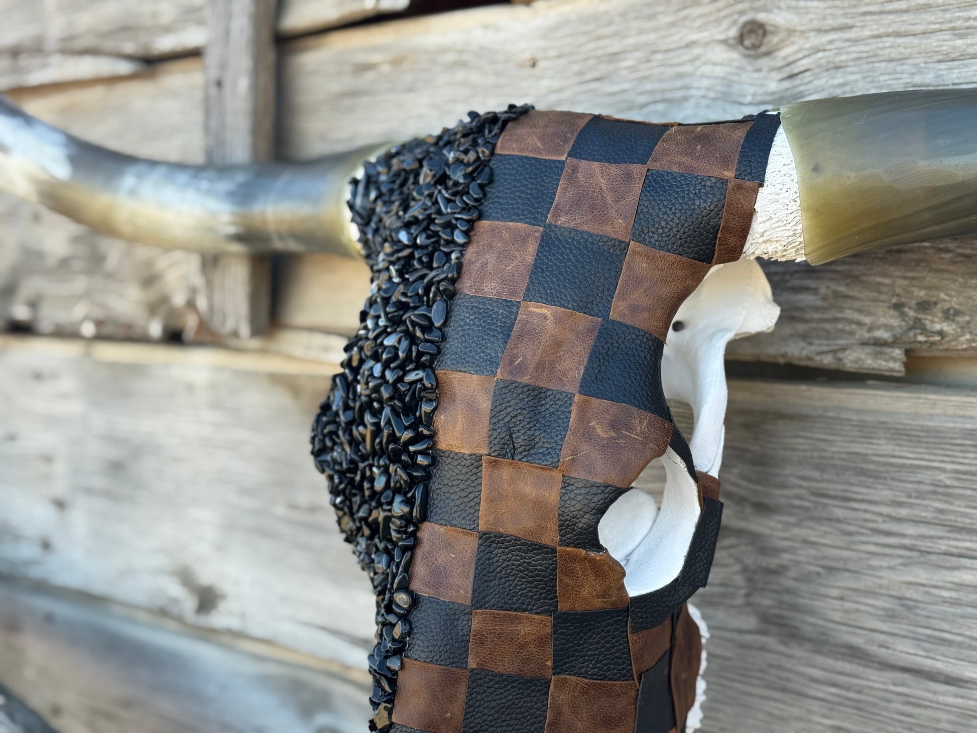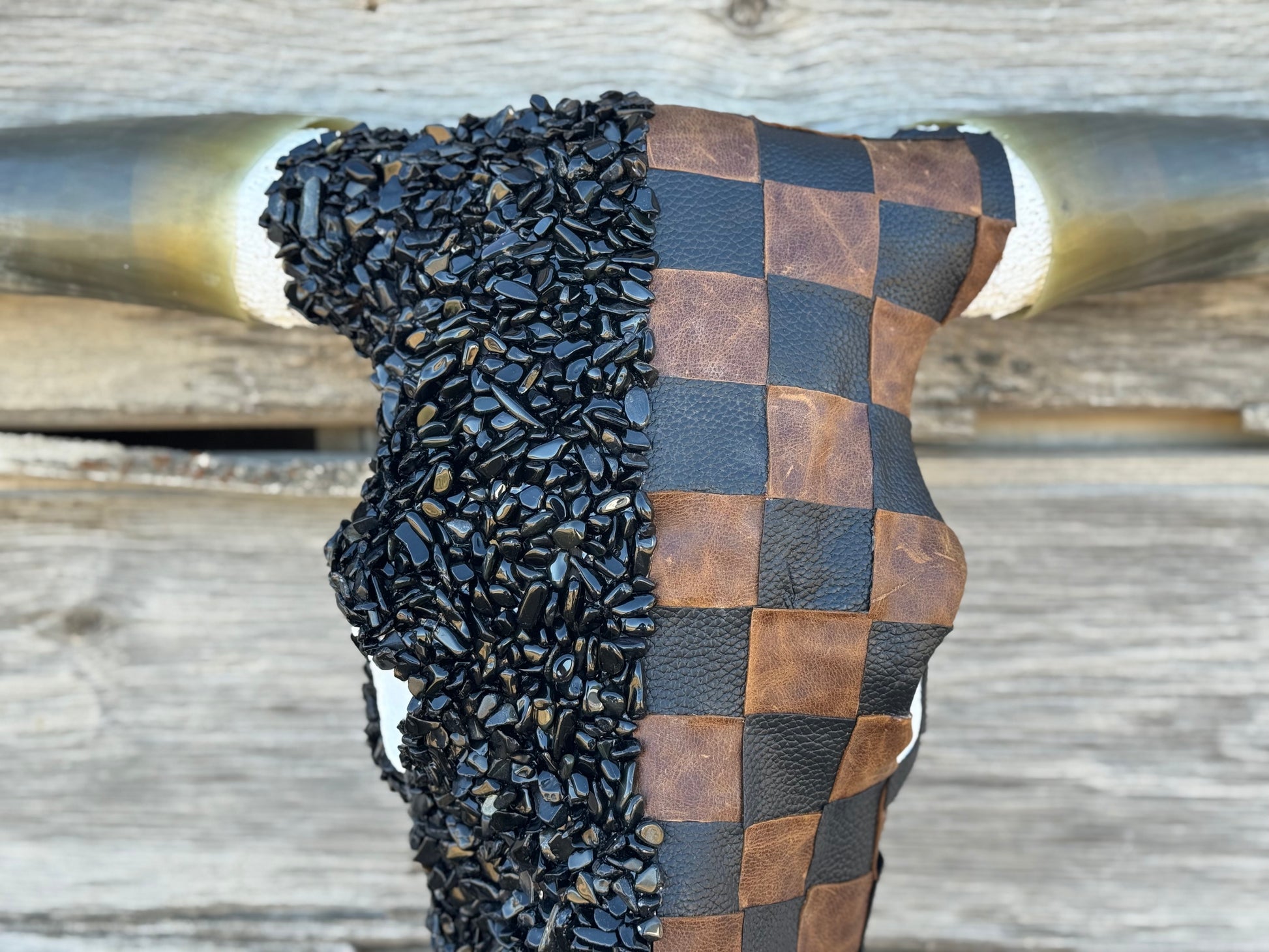 Authentic Texas longhorn skull, embellished with leather patches & obsidian stones.