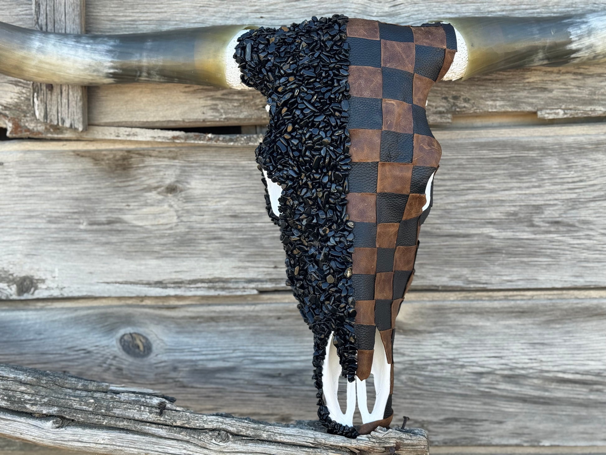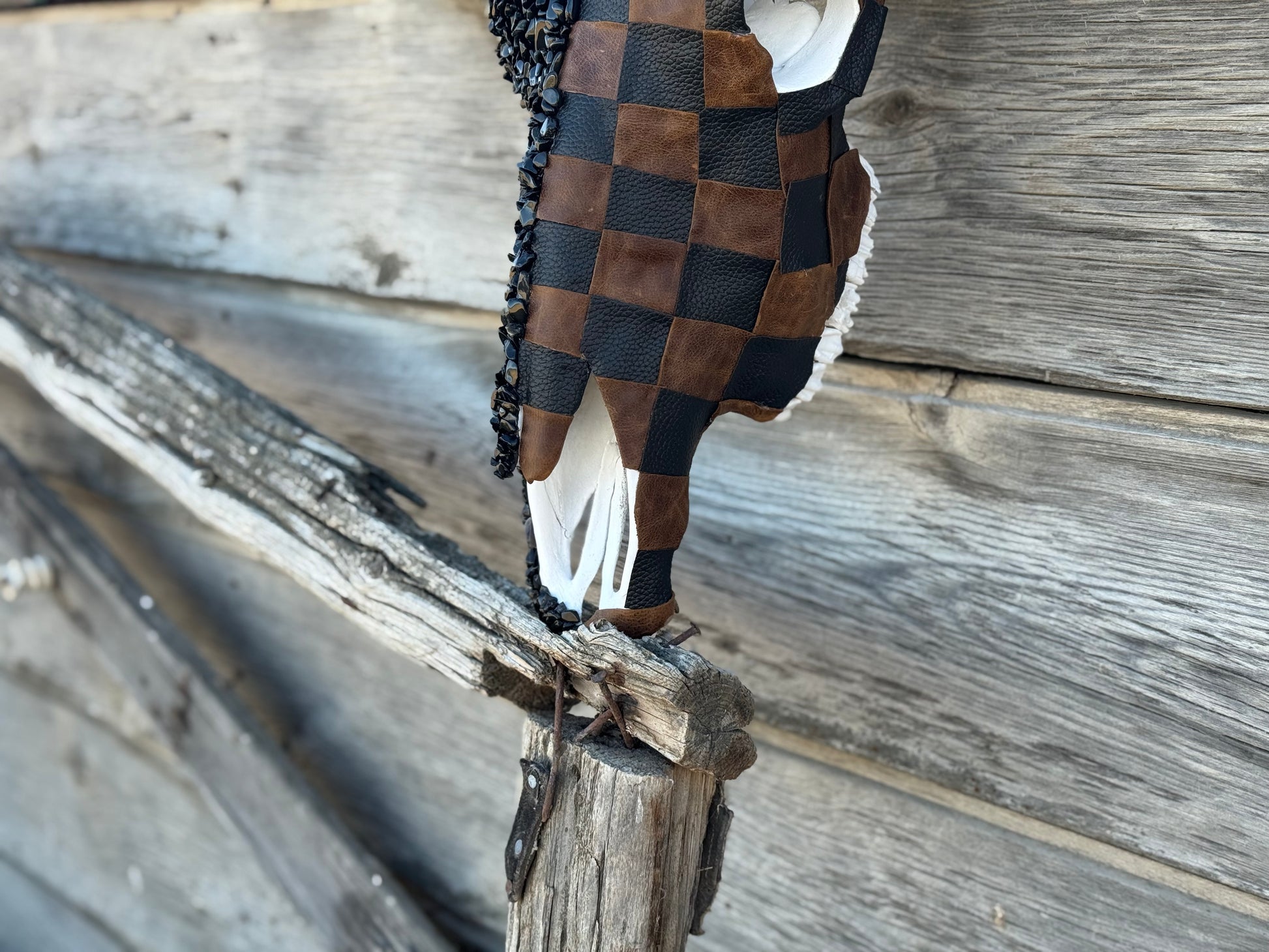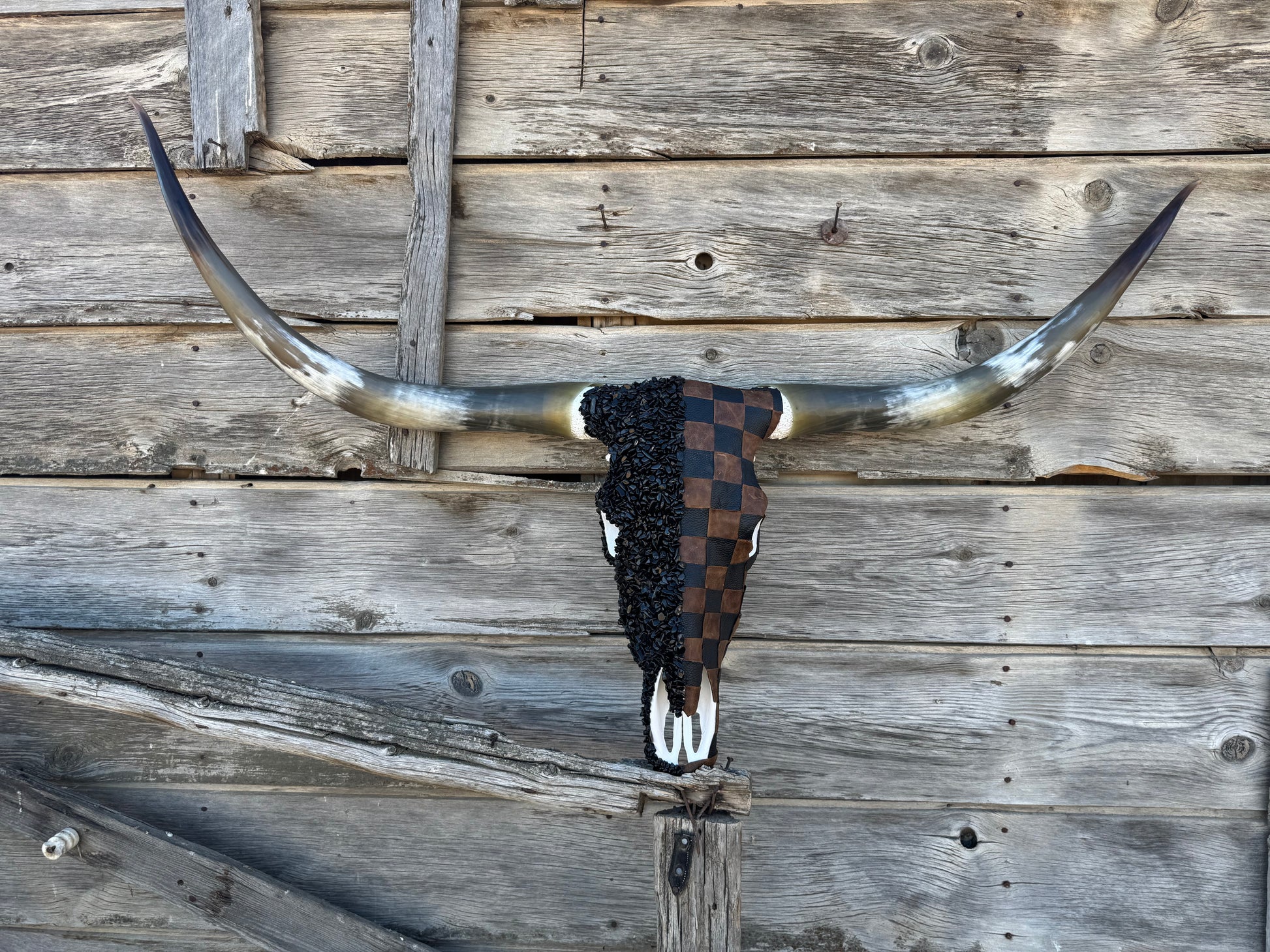 Authentic Texas longhorn skull, embellished with leather patches & obsidian stones.