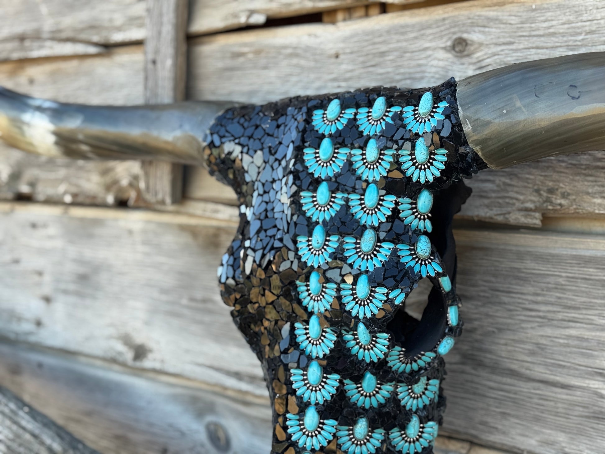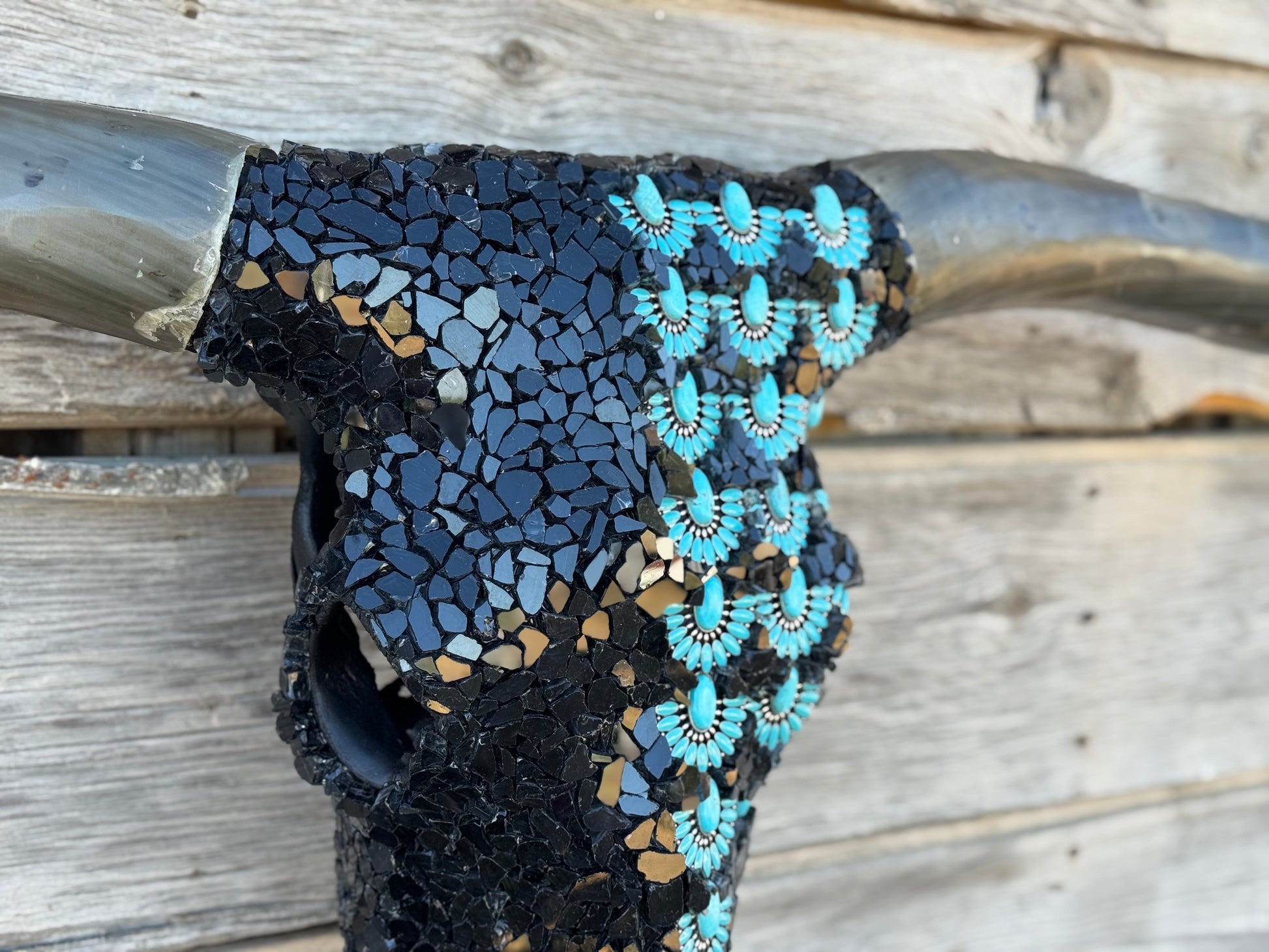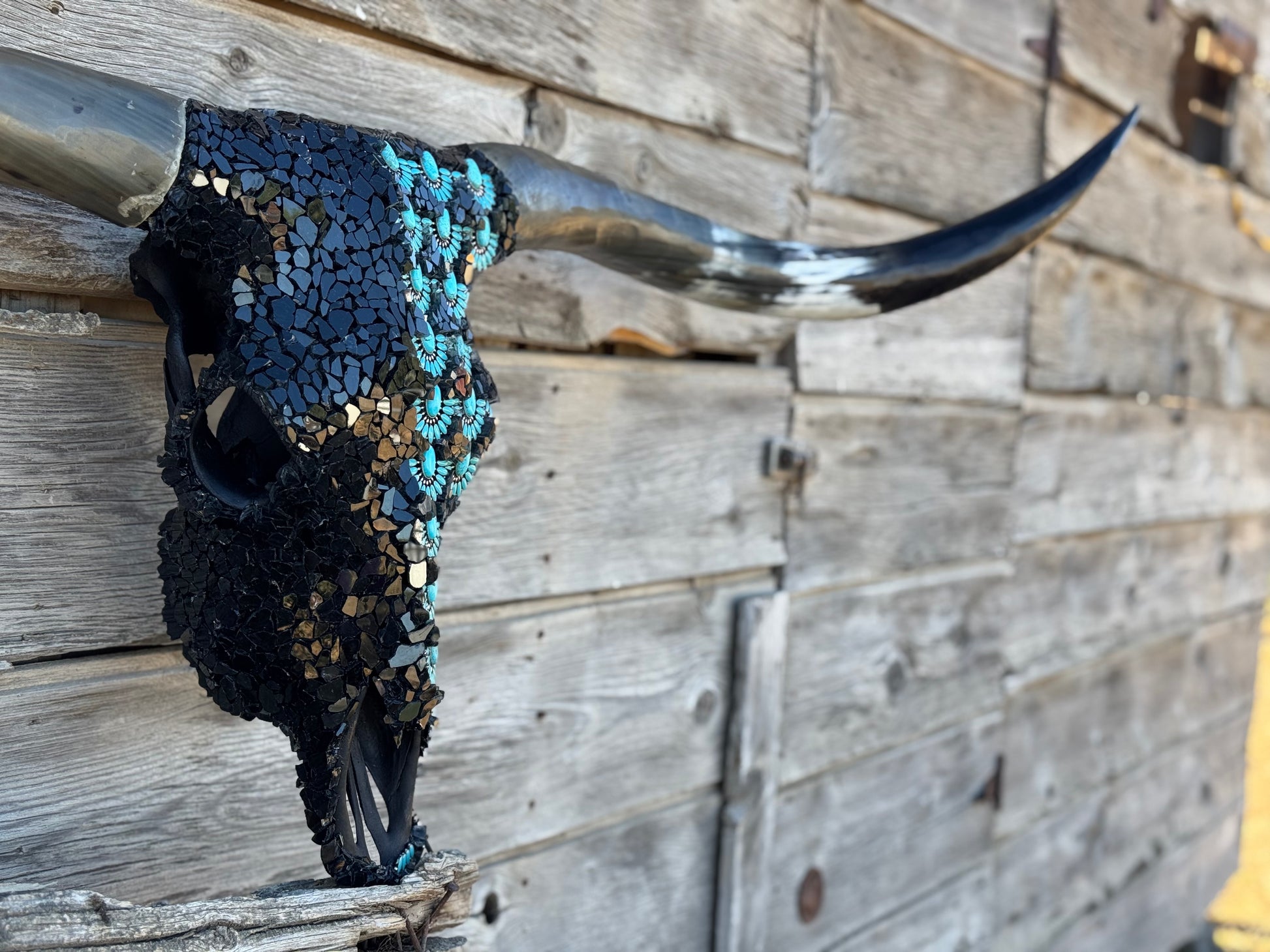 Real authentic Texas Longhorn, black glass embellished with faux turquoise stones.