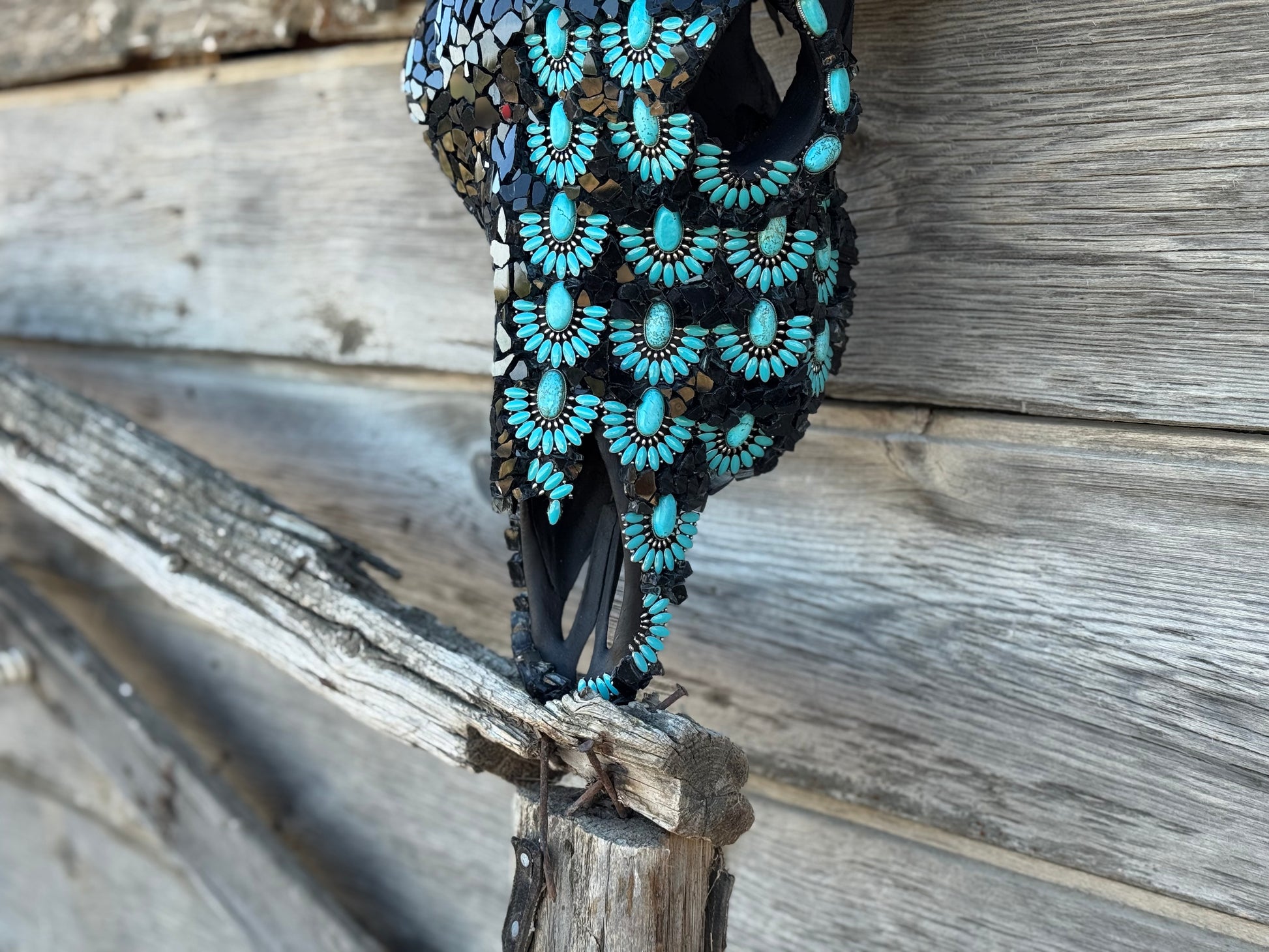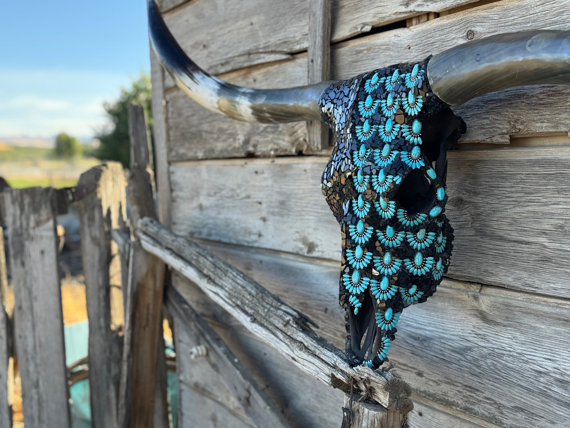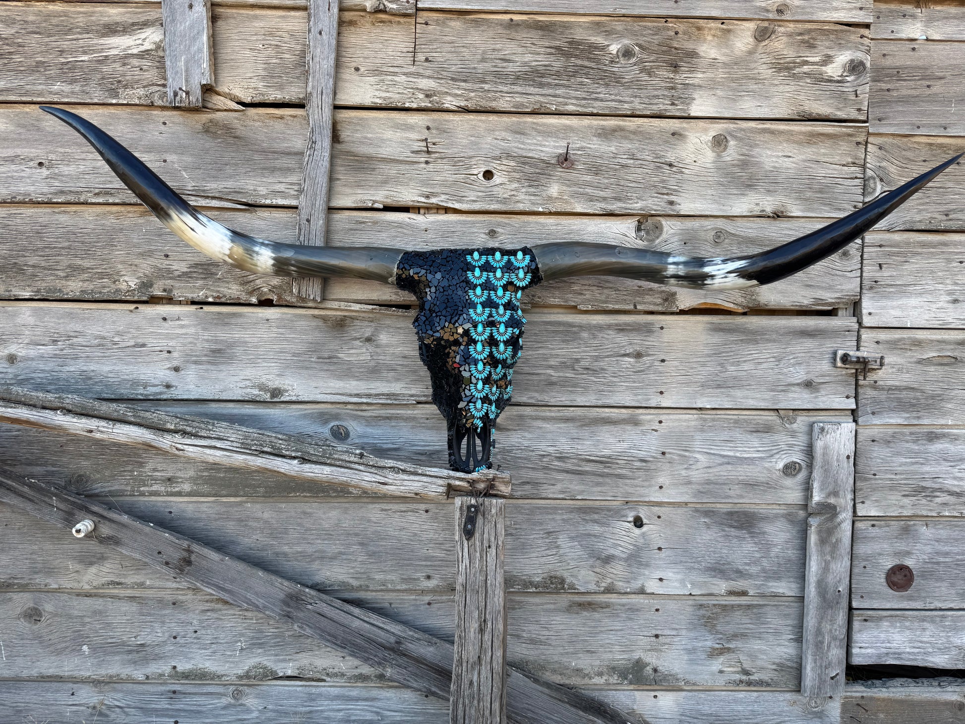Real authentic Texas Longhorn, black glass embellished with faux turquoise stones.